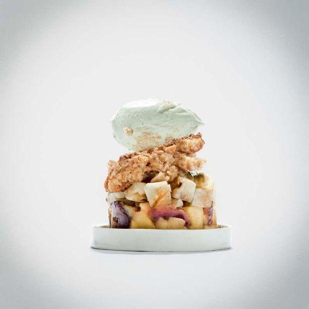 Couvrez de pâte en la saupoudrant du bout des doigts, puis enfournez pendant 30 min sur une grille. Servez le crumble tiède ou froid, accompagné de glace à la vanille.