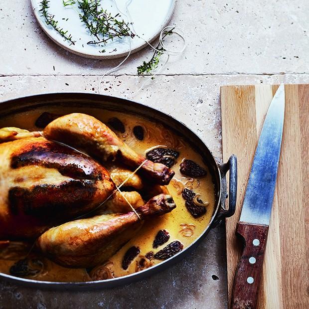 Découpez la volaille et déposez les morceaux dans un plat, arrosez de sauce. Accompagnez des morilles et de pommes de terre écrasées.